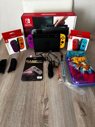 Consola Nintendo Switch con varios accesorios. - Incluye consola, base, Joy-Cons de varios colores y fundas. - Estuche de transporte con diseño de Pokémon. - Protector de pantalla para la consola.