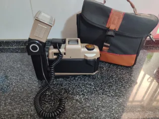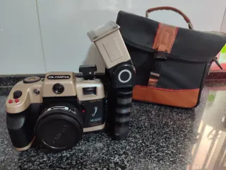 Cámara Olympia NK4040 con motor drive y flash externo. - Diseño en color dorado y negro. - Incluye flash. - Incluye bolsa de transporte.