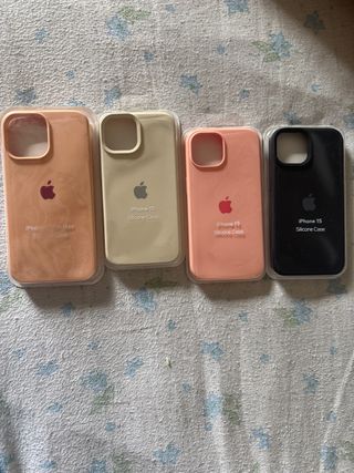 Fundas de iPhone 15 y 13 Pro Max de distintos colores se venden por separado!! Hay varias de cada tipo por si quereis mas de una. PRECIO NEGOCIABLE En perfectas condiciones Calidad 1:1 perfecta - Funda color melocotón para iPhone 13 Pro Max. - Funda color crema para iPhone 15. - Funda color rosa para iPhone 15. - Funda color negro para iPhone 15.