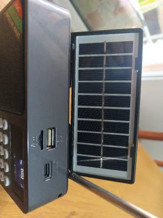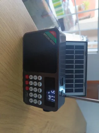 Radio portátil JOC REC-S H6108 con panel solar. Es regalo de reyes, nunca usada. Color gris. Diseño compacto y moderno. Panel solar integrado para carga. Teclado numérico para sintonización. Capta FM, lee tarjeta de memoria y USB. Tiene panel solar, se carga con adaptador de 5v 3W y lleva batería extraíble. Tiene bluetooth. Permite grabar emisoras de radio y grabación por micrófono. Se entrega en su caja tal como la recibí con batería, cable de carga y manual. Todo en su caja .