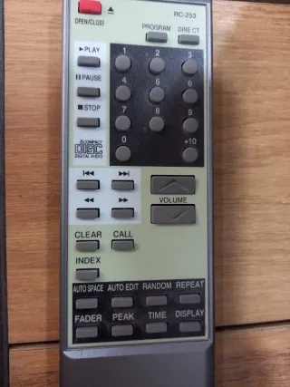 Mando a distancia para equipos de audio o vídeo. - Modelo: RC-253 - Botones: PLAY, PAUSE, STOP, PROGRAM, DIRECT, CLEAR, CALL, INDEX, AUTO SPACE, AUTO EDIT, RANDOM, REPEAT, FADER, PEAK, TIME, DISPLAY. - Teclado numérico: 0-9 y +10. - Control de volumen. - RC-253 Control remoto para reproductor de CD Denon: DCD2800 1015CD DCD790 DCD830 DCD1460 DCD1650 DCD810 DCD815 RC-251 DCD-625 RC-255 Standard estándar video amplificador audio musica sonido altavoces altavoz CD dvd reproductor equipo