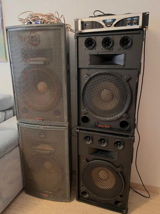 Son dos top 2x15 de medios con trompeta de agudos, cada uno de 1700w rms. Son la red edición pintados en negro, una pasada como suenan. A uno le suena una madera pero se arregla con un par de tornillos. Con sus ruedas para el transporte, todos los componentes space equipment No mareantes ni regateos precio fin 1000 Para cambios valoro 1400 que en componentes ya valen más. No se envían, si E preparan para recogida Space equipment, das, mackie, fane, musicson, dat, sonido profesional, sonido directo, altavoces, discoteca, Allen heath, etapas, amplificador, electrovoice, mesa amplificación, Cajas altavoces, equipo musica