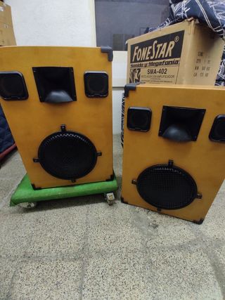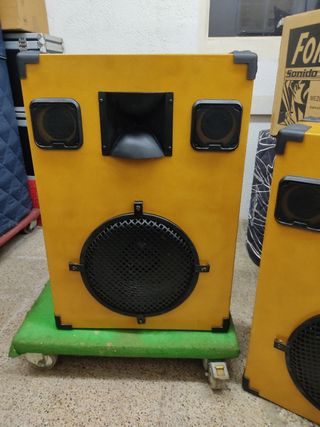 Vendo equipo de musica para fiestas, casa, gaming, pc, car audio, home cinema, conexión rapida para coche (14 v) y para casa (230v). Todo tapizado. Con asas de agarre y ruedas transporte desmontables. Separación max. entre altavoces 3 metros. Alta potencia. Refrigeración. Todo bien cableado y ajustado. Trasera con metacrilato. Rejillas de protección sub. Fusibles. Ajuste equalizador, salida subwoofer, Radio con conexión USB, Bluethoot, aux- in. 2 ud Medios 8" ciare 250w 2 ud Agudos 12" beyma 500W 2 ud Coaxial 2 vias kenwood 13 cm 250 w 2 ud subwoofer mtx 15" 500 w Capacitador Etapa pot. kipus carbono 2400 w Ampli monof. 2000w