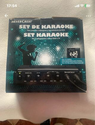 Equipo de karaoke SilverCrest con múltiples funciones. - Conexión para televisores y reproductores de DVD. - Incluye 15 éxitos internacionales para fiestas. - Controles de volumen para música y micrófonos. - Control de eco. - Entradas para dos micrófonos (MIC1 y MIC2). Se vende por no saber ponerlo,nunca se ha usado