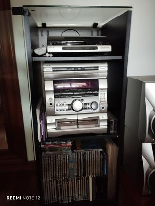 Se vende equipo de música completo con altavoces y mueble. - Modelo RX77 DISC EX-CHANGE/MINI HI-FI COMPONENT SYSTEM. - Altavoces Sony - Mueble para equipo de sonido con ruedas. - Medidas del mueble: 40x40x97 cm. - No incluye los CD.