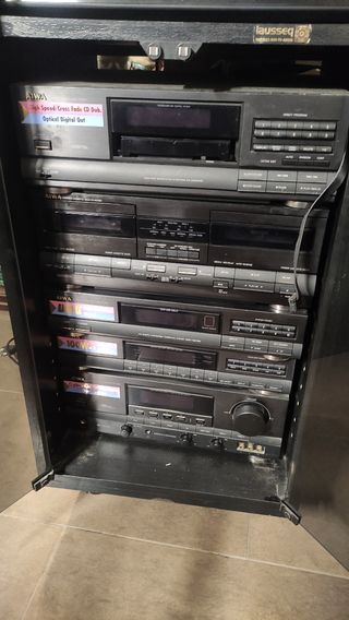 Equipo de música Aiwa.Dos altavoces, doble pletina,cargador de 5 CD.El tocadiscos está sin estrenar.Todo funciona perfectamente.