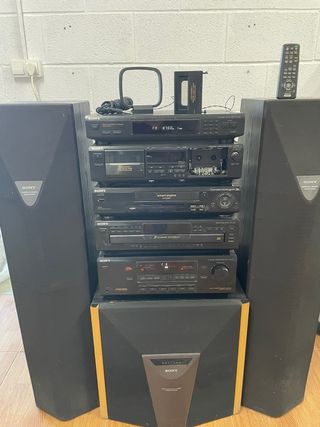 Sistema de sonido Sony con varios componentes. - Amplificador - Reproductor de CD - Sintonizador de radio FM - Reproductor de casetes - Altavoces 160W - Subwoofer 90W - Mando a distancia