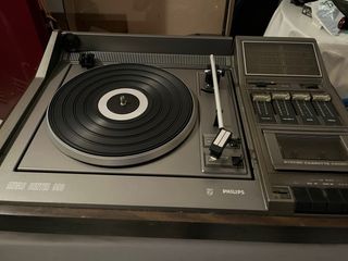 Equipo de sonido vintage que combina tocadiscos con tapa y reproductor de casetes. - Marca Philips. modelo music center 990. - Medidas 60x43