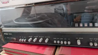 Equipo de sonido vintage Koniger 5200 con tocadiscos y reproductor de casete. Un clásico para los amantes de la música. - Diseño retro en negro y plateado. - Controles de volumen, graves y agudos. - Sintonizador de radio AM/FM.