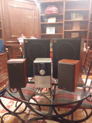Equipo de sonido Sony con altavoces y unidad central. - Dos altavoces frontales de color marrón y negro. - Dos altavoces traseros de color negro. - Unidad central de sonido plateada y negra.