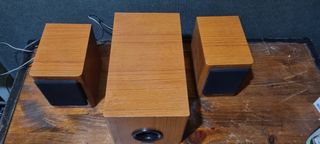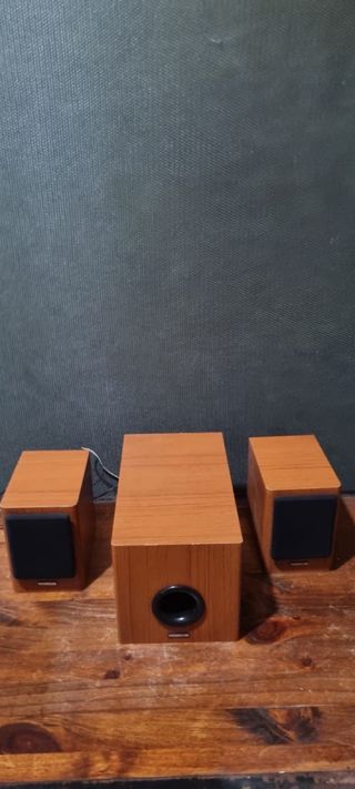 En venta sistema de sonido de 3 piezas (2.1) con un elegante acabado en madera clara. Ideal para mejorar el audio de tu ordenador, televisor o para montar un pequeño cine en casa con un toque clásico y natural. Características principales: Subwoofer central: Diseño compacto con puerto bass reflex frontal para unos graves profundos y nítidos. Altavoces Satélite (x2): Dos torres pequeñas a juego para un sonido estéreo claro. Estilo: El acabado en madera encaja perfectamente en cualquier salón o escritorio. Ideal para: Escuchar música, gaming o ver películas con una experiencia de sonido más envolvente que los altavoces estándar.