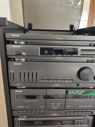 Se vende equipo de música Philips modular original (serie 9000), en muy buen estado y totalmente completo. Incluye: • Tocadiscos Philips FP9510 • Sintonizador digital Philips FT9510 • Amplificador Philips FA9510 • Doble pletina cassette FC9510 (auto-reverse) • Reproductor CD Philips AK601 • Altavoces Philips de 3 vías con woofer grande • Mueble original con ruedas Equipo potente y con gran calidad de sonido, de la época en la que Philips fabricaba sistemas Hi-Fi por componentes reales (no minicadenas ligeras). Ideal para vinilos, cassettes, CDs o colección vintage. Se puede ver y probar sin compromiso. Precio: 250 € negociables