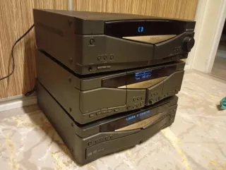 Equipo de sonido modular Kenwood en color negro y gris. Consta de tres unidades apilables. - Unidad de amplificador con salida para 5 altavoces y subwoofer, bastantes entradas de audio para conectar cualquier fuente de audio externa . - mando a distancia original que le falta la tapa de las pilas, funciona bien también. -Todo funciona perfectamente y revisado. - Unidad central con doble pletina de cassette. - Unidad inferior con reproductor de CD. - Control de volumen giratorio.