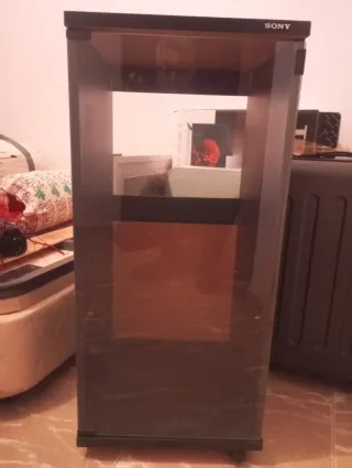 Mueble de diseño moderno para tu equipo de sonido. PRECIO NEGOCIABLE - Estructura de cristal y madera. - Compartimentos amplios para componentes. - Base con ruedas para fácil movilidad. Alto 89 cm Ancho 41 cm Fondo 43 cm