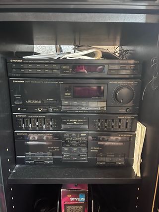 Sistema de sonido Pioneer en color negro, ideal para disfrutar de tu música. - Sintonizador FM/AM digital. - Doble pletina de casete. - Ecualizador estéreo. - Control independiente L/R. - Surround & Stereo Wide. Altavoces. A recoger en Alcorcón