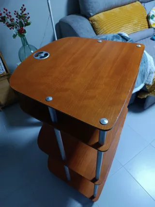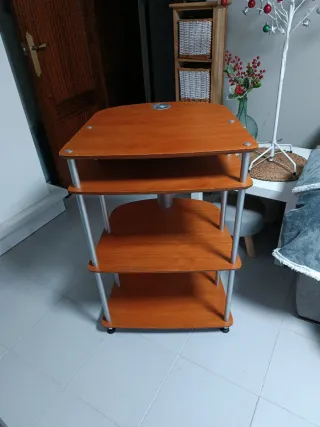 Mesa auxiliar de madera con diseño moderno y práctico,es una mesa muy buena de madera, madera, con túbo para esconder cables.está en muy buen estado,fuè carísima por el material que tiene. Muchas estávilidad y pesa bastante TV, EQUIPO DE MÚSICA,CD,CONSOLAS,JUEGOS,DVD ETC - Estructura de madera con acabado en tono cálido. - Patas metálicas plateadas. - Tres estantes para colocar equipos de audio, televisión o decoración.