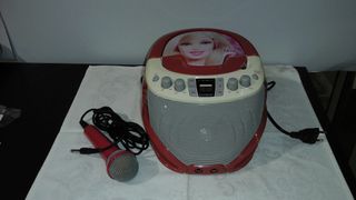Reproductor de CD y karaoke con diseño de Barbie. Micrófono incluido y un CD de música infantil. El equipo está en muy buen estdao de conservación; solo tiene algo de falso contacto en el botón Master Vol y a la entrada del microfono. En las dos últimas fotos se puede observar que el lector reconoce las pistas del cd. Y en la foto de la parte posterior, vemos que tiene una salida para video y para audio, de forma tal que se puede conectar con otros equipos. No se hacen envíos. Tanto la entrega del producto, así como el cobro, se hace en mano. Le atiendo de lunes a viernes, de 09:00hr a las 13:00hr.