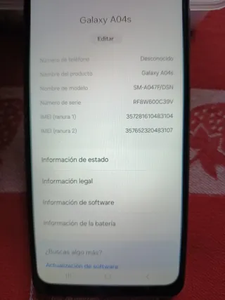 Teléfono móvil Samsung Galaxy A04s. - Modelo: SM-A047F/DSN - Número de serie: RF8W600C39V - IMEI (ranura 1): 357281610483104 - IMEI (ranura 2): 357652320483107