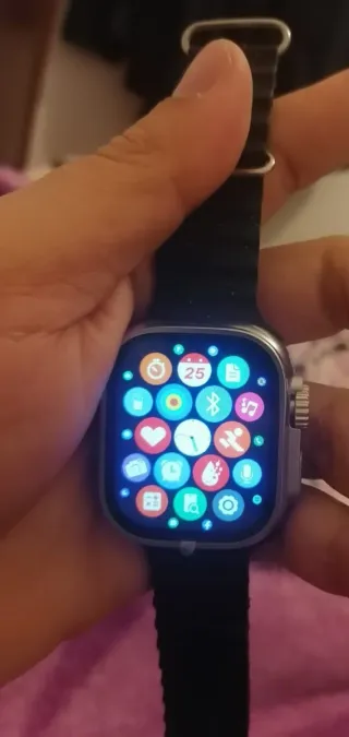 Reloj inteligente con un diseño moderno y elegante. - Correa de tela negra. - Caja de metal plateada.
