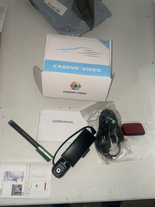 Cámara frontal para coche de la marca CARDVR. Incluye manual de usuario y accesorios. - Color negro. - Incluye cable de alimentación y soporte adhesivo.