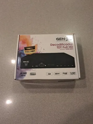 Decodificador TDT Full HD de la marca GEN-X, modelo DVBT-5522. - Compatible con H.265 HEVC y MPEG4. - Soporta resolución 1080p Full HD. - Incluye conexión USB y función PVR. - Certificación DVB-T2 Terrestrial.