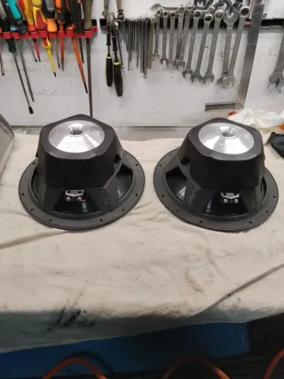 Par de subwoofers con cajón. Aunque no sale en la foto se incluye el cajón doble bax reflex,son de 12 pulgadas de 1500 watios,550 rms o watios reales,bobina simple a 4 ohmios. No se envían por su alto peso solo recojida en mano. Si solo se quieren los graves si los envío por 150€ y modifico el anuncio
