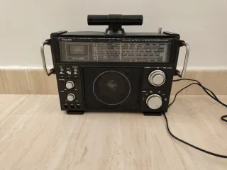 Radio multibanda de la marca Venturer, específicamente un modelo clásico 2959-2. Tipo: Receptor de radio multibanda portátil de estilo vintage, popular en la década de 1980. Capacidades: Capaz de sintonizar bandas AM, FM, Onda Corta (SW), Banda Ciudadana (CB) y frecuencias de TV. Características: Incluye un "Two Way Meter" (medidor de dos vías), asa de transporte y sintonizador fino. Funcionamiento: Puede funcionar con corriente alterna (AC 220V) o pilas (DC 6V). Vintage de los años 80. Funciona perfectamente. Algún signo del paso del tiempo como asas con alguna mancha de oxido (ampliar fotos para velo todo con detalle).