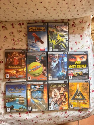 Colección de 10 videojuegos para PC de la marca FX. - Pro Race Driver - Imperivm II - Virtua Tennis - Sacred - Supreme Snowboarding - Port Royale - MotoGP - Drácula II - Delta Force 2 - Mars Invader