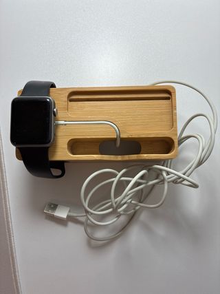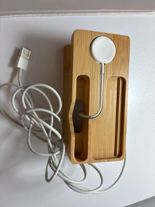 Base de carga de diseño en madera para iWatch. Mantiene tu reloj organizado y listo para cargar. - Material: Madera. - Diseño elegante y funcional.