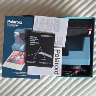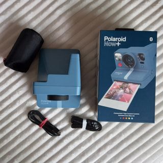 Cámara instantánea Polaroid Now+ en color azul. Conecta a la app para pintar con luz, la doble exposición, el modo manual de apertura y velocidad, el timer... Tiene lo necesario para ponerla en trípode. Doble lente con autofoco para más claridad. Apenas usada. Los cables conectores casi sin tocar.