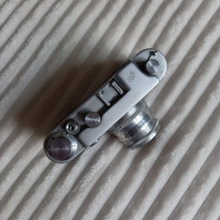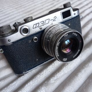 Cámara analógica rangefinder FED-2 con lente Industar 26M. Modelo de 1957. Ucrania. Réplica de Leica Lente 52mm con apertura 1:2,8. Se fabricó entre 1957-59. Con una pequeña manivela para manejar el rangefinder. Tiene los evidentes signos de desgaste de tanto tiempo. La lente funciona bien. Se puede usar en digitales usando el adaptador M39.