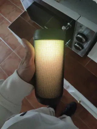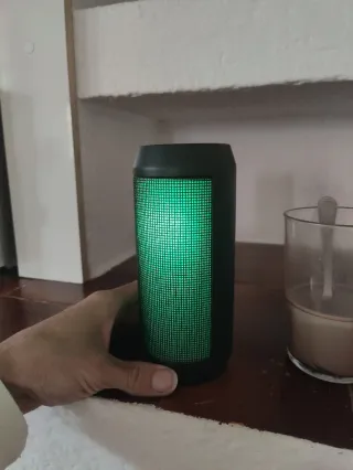 Altavoz portátil con un diseño moderno y llamativo. - Batería recargable. - Acabado en malla. - Luces LED integradas.