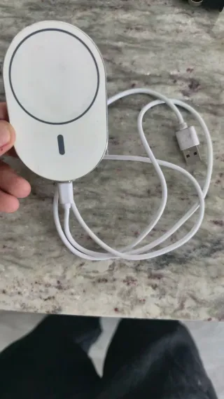 Este cargador inalámbrico magnético es blanco y se conecta mediante USB. - Diseño redondo con borde plateado. - Indicador LED en la parte frontal.