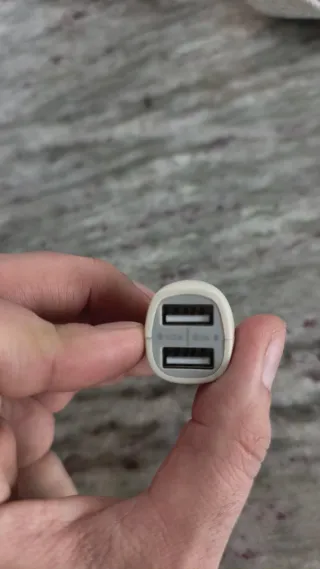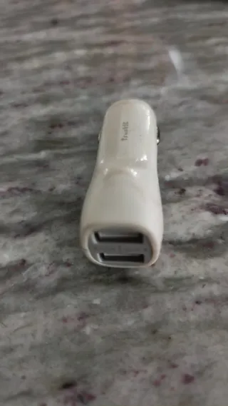 Cargador de coche con dos puertos USB para cargar tus dispositivos mientras viajas. - Dos puertos USB disponibles. - Salida de 2.1A en uno de los puertos.