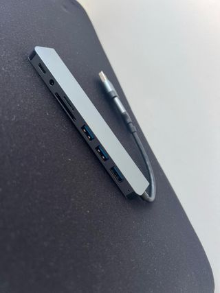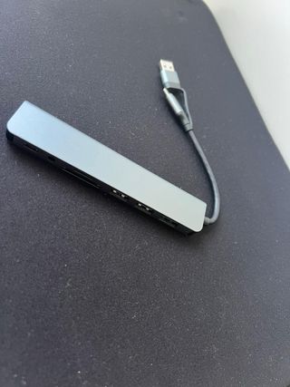 Adaptador de conexión tipo C con múltiples puertos. Su diseño es elegante y compacto. - Puertos USB-A - Lector de tarjetas SD y microSD - Puerto de audio 3.5mm - Puerto USB-C adicional Nuevo sin estrenar