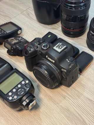 Kit de fotografía completo con cámara Canon EOS R6 Mark II, objetivos y accesorios. Canon EOS R6 Mark II Canon EF 24-70mm f/2.8L IS USM Sigma 15mm f/2.8 EX DG Fisheye Canon Adaptador EF-RF Canon batería Powershot baterias x3 Godox V1 C Pro Godox XPro C Godox X1R-C *Tengo todas las cajas