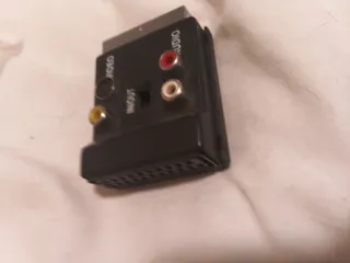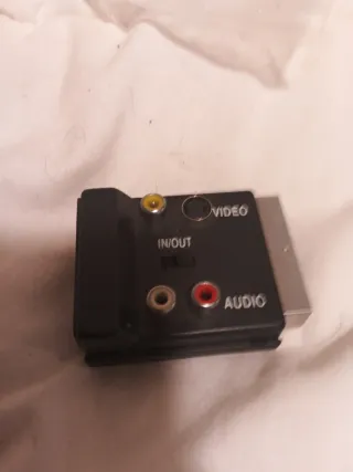 Adaptador para conectar dispositivos de vídeo y audio. - Conexión SCART. - Entradas para vídeo y audio. - Interruptor IN/OUT.