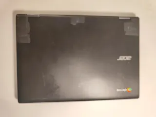 Chromebook Acer en color negro. Ideal para tareas diarias y para el instituto. - Diseño compacto y ligero. - Cubierta con acabado mate. ⚠️ Le faltan dos teclas, y la pantalla se abre levemente, por eso tiene cinta. Todo lo demás està bien. Para piezas puede ir muy bien.
