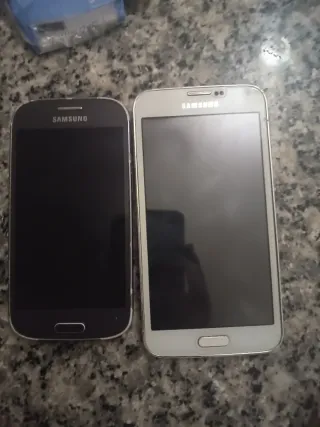 Dos teléfonos móviles Samsung, uno negro y otro plateado, ideales para piezas o para quien sepa repararlos. - Teléfono móvil Samsung negro. - Teléfono móvil Samsung plateado.