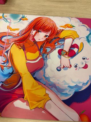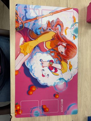 Tapete de juego con diseño de Nami del anime One Piece. - Ilustración vibrante de Nami. - Espacio para cartas y juego. - Diseño temático de One Piece.
