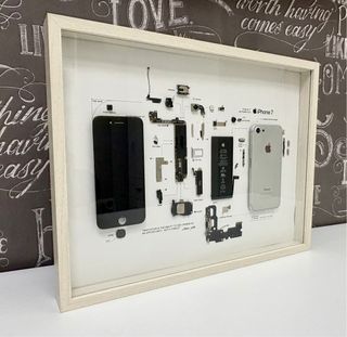 Marco decorativo con los componentes internos de un iPhone 7. - Tamaño A3 - Exhibición detallada de las partes del teléfono. - Incluye el teléfono desmontado y sus componentes.