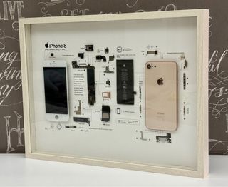 Marco decorativo con el despiece de un iPhone 8 Plus. Una pieza única para los amantes de la tecnología. - Tamaño A3 - Componentes internos del iPhone 8 Plus. - Marco de madera claro.