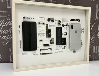 Marco decorativo con los componentes internos de un iPhone X. - Tamaño A3 - Pieza de colección para amantes de la tecnología. - Diseño detallado de los componentes. - Marco de madera claro.