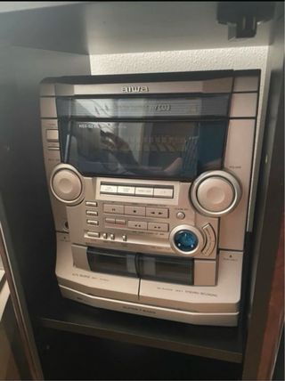 Minicadena Aiwa con un diseño elegante en tonos plata y marrón. - Incluye dos altavoces. - Soporte para los altavoces.