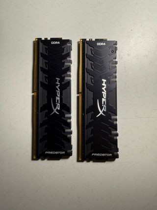 Dos módulos de memoria RAM HyperX Predator DDR4 con iluminación RGB. - Capacidad total de 16GB (2x8GB). - Velocidad de 3600MHz. - Diseño Predator con disipador negro. Se venden porque las cambie por unas DDR5, funcionan perfectamente. No conervo la caja.