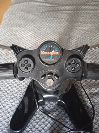 Volante de carreras con diseño de moto para PlayStation 2. - Manillar con acelerador y freno. - Indicador de velocidad. - Botones de control integrados.