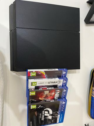 Consola PlayStation 4 en color negro, junto con cuatro videojuegos. - Juegos incluidos: Gran Turismo Sport, NBA 2K17, FIFA 21 (Champions Edition), FIFA 20. - Compatible con PlayStation VR.