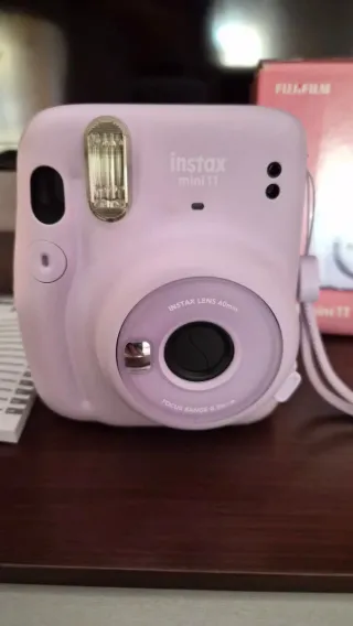 Cámara instantánea Fujifilm Instax Mini 11 en color morado. No incluye papel, utilizada en una ocasión. Tiene su caja original y sus instrucciones. - Incluye correa para la muñeca. - Lente de 60mm.