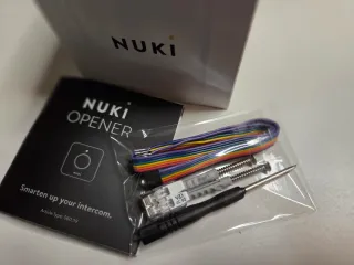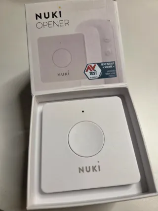 Dispositivo Nuki Opener para control de acceso inteligente. Sirve para domotizar la puerta del patio sustituyendo o complementando al telefonillo de casa. - Smart Home. - Compatible con Alexa. Está como nuevo. Solo ha estado conectado 1 semana. Se lo puse a mis padres pero son mayores y no les ha gustado la idea. Me han hecho quitarlo. Funciona con 4pilas AAA (no incluidas) aunque también tiene conexión microUSB para carga.