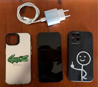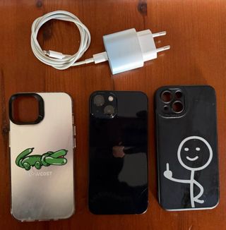 Teléfono móvil iPhone 13 en color negro con 128GB de almacenamiento. La batería tiene un 77% de capacidad. - Incluye cargador y cable. - Se incluyen dos fundas protectoras.